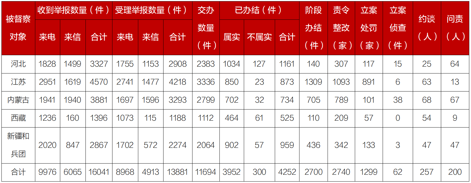 有關?。ㄇ┖捅鷗叨戎厥傭講旃ぷ?,將督察作為堅決貫徹習近平生態文明思想的重要內容,作為推動高質量發展的重要契機,主要領導通過督察動員、現場督辦、召開專題會議等方式,大力推動整改落實。截至4月25日,各督察組共收到群眾來電、來信舉報16041件,受理有效舉報13881件,經梳理合并重復舉報,累計向相關省(區)和兵團轉辦11694件。相關省(區)和兵團已辦結或階段辦結6952件。其中,立案處罰1299家,立案偵查62件;約談黨政領導干部257人,問責黨政領導干部200人。