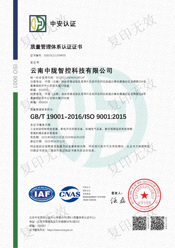 加拿大28咪牌智控ISO 9001質量管理體系認證證書