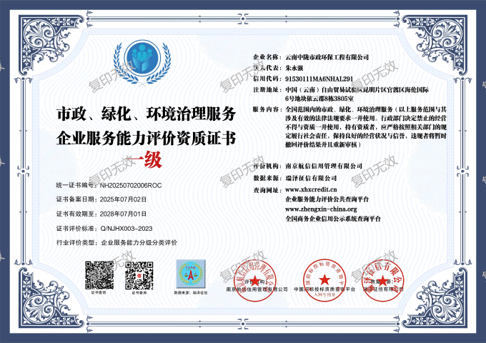 市政、綠化、環(huán)境治理服務企業(yè)服務能力評價資質證書
