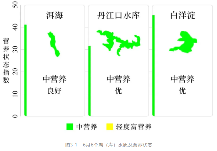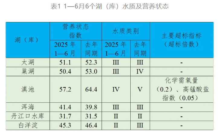 1—6月,監測的209個重點湖(庫)中,水質優良(Ⅰ—Ⅲ類)湖庫個數占比78.0%,同比下降1.5個百分點;劣Ⅴ類水質湖庫個數占比3.8%,同比下降0.5個百分點。主要超標指標為總磷、化學需氧量和高錳酸鹽指數。202個監測營養狀態的湖(庫)中,重度富營養的1個,占0.5%;中度富營養的5個,占2.5%;輕度富營養的44個,占21.8%;其余湖(庫)為中營養或貧營養狀態。其中,太湖和巢湖水質均為良好、輕度富營養;滇池為輕度污染、輕度富營養,主要超標指標為化學需氧量和高錳酸鹽指數;洱海水質良好、中營養;丹江口水庫和白洋淀水質均為優、中營養。