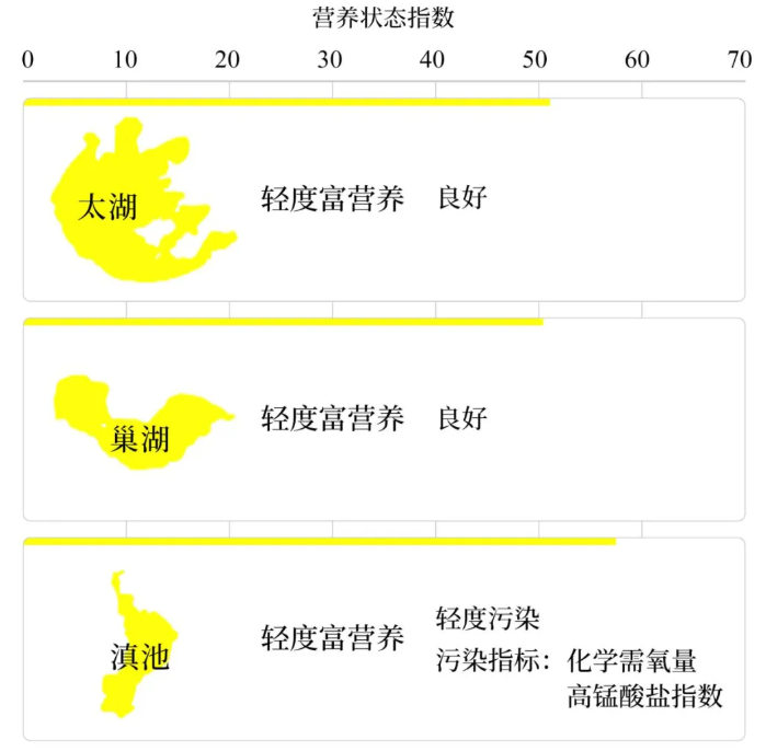第二季度,監測的209個重點湖(庫)中,水質優良(Ⅰ—Ⅲ類)湖庫個數占比76.1%,同比下降2.0個百分點;劣Ⅴ類水質湖庫個數占比2.4%,同比下降1.9個百分點。主要超標指標為總磷、化學需氧量和高錳酸鹽指數。200個監測營養狀態的湖(庫)中,重度富營養的1個,占0.5%;中度富營養的5個,占2.5%;輕度富營養的43個,占21.5%;其余湖(庫)為中營養或貧營養狀態。其中,太湖水質良好、輕度富營養;巢湖為輕度污染、輕度富營養,主要超標指標為總磷;滇池為輕度污染、輕度富營養,主要超標指標為化學需氧量和高錳酸鹽指數;洱海和白洋淀水質均為良好、中營養;丹江口水庫水質為優、中營養。