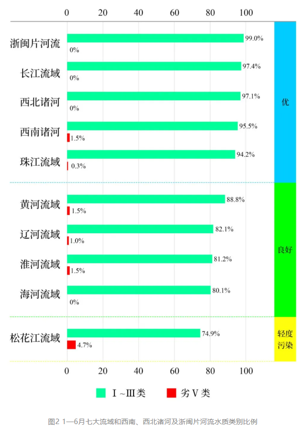 1—6月,長江、黃河、珠江、松花江、淮河、?:印⒘珊擁繞嘰罅饔蚣拔鞅敝詈?、西南諸河和浙閩片河流水質優良(Ⅰ—Ⅲ類)斷面比例為90.4%,同比上升0.1個百分點;劣Ⅴ類斷面比例為0.8%,同比上升0.3個百分點。主要超標指標為化學需氧量、高錳酸鹽指數和五日生化需氧量。其中,浙閩片河流、長江流域、西北諸河、西南諸河和珠江流域水質為優;黃河、遼河、淮河和?:恿饔蛩柿己茫凰苫ń饔蛭岫任廴?。
