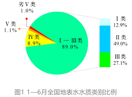 1—6月,3641個國家地表水考核斷面中,水質優良(Ⅰ—Ⅲ類)斷面比例為89.0%,同比上升0.2個百分點;劣Ⅴ類斷面比例為1.0%,同比上升0.2個百分點。主要超標指標為化學需氧量、高錳酸鹽指數和總磷。