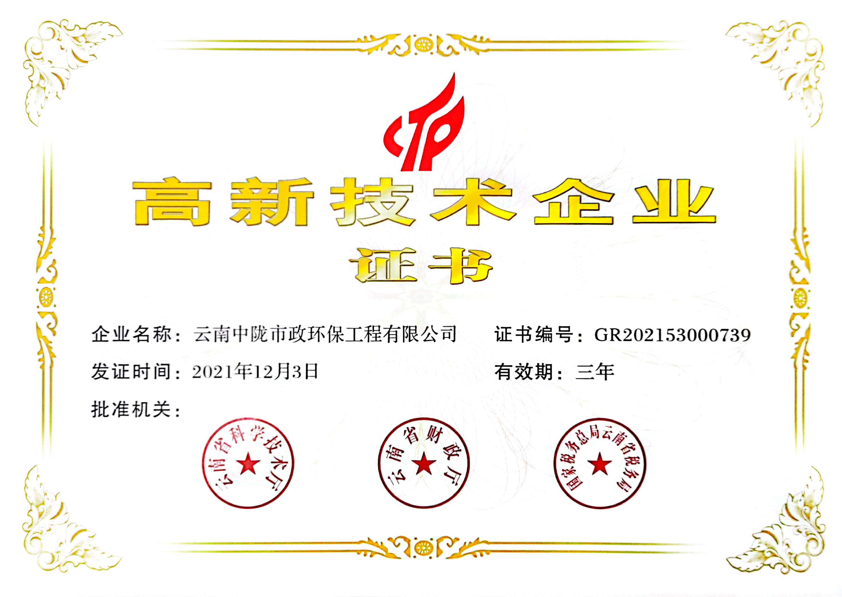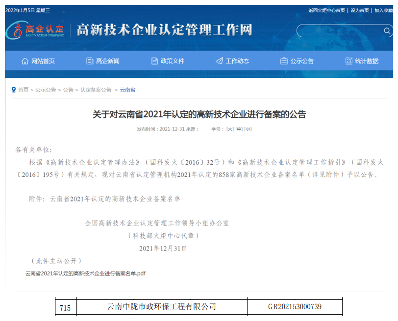 2021年12月31日,全國高新技術企業認定管理工作領導小組辦公室發布《關于對云南省2021年認定的高新技術企業進行備案的公告》,云南加拿大28咪牌市政環保工程有限公司入圍名單,榮獲國家級高新技術企業認定。