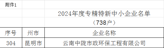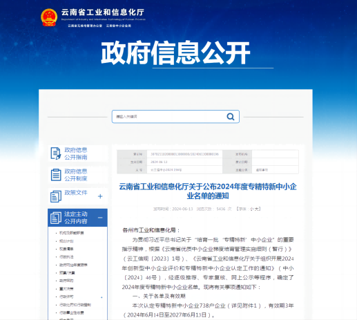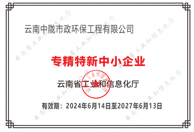 2024年6月13日,云南省工業(yè)和信息化廳發(fā)布《2024年度專精特新中小企業(yè)名單》,云南加拿大28咪牌市政環(huán)保工程有限公司榮獲專精特新中小企業(yè)稱號。