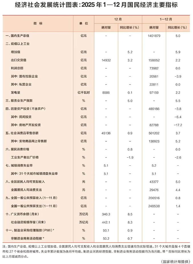 國家統計局 | 經濟社會發展統計圖表:2025年1—12月國民經濟主要指標