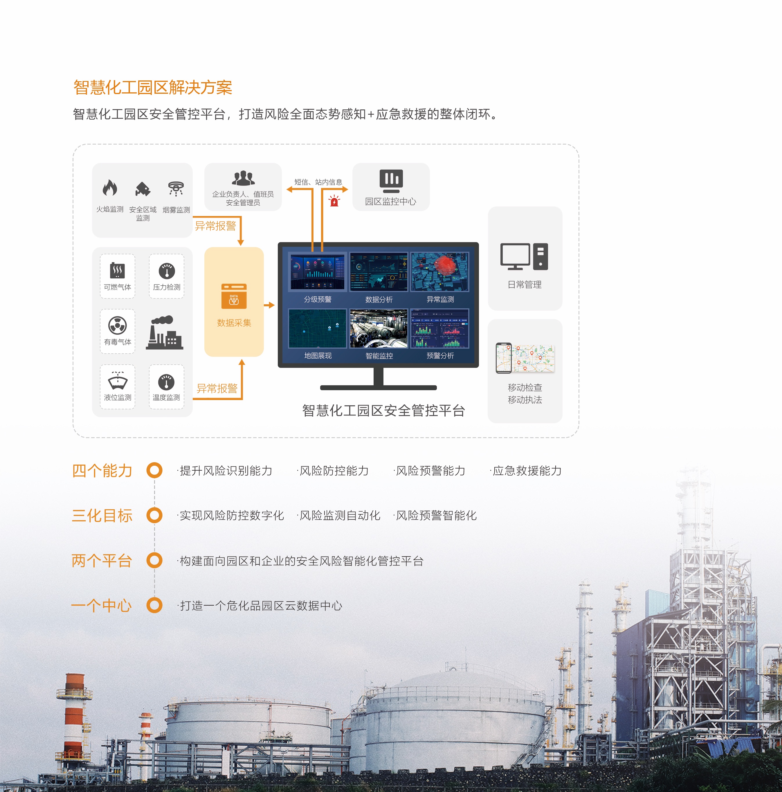 我司以聚焦提高應急管理廳科學化、專業(yè)化、智能化、精細化水平為目標,積極探索現(xiàn)代“智”理的信息化解決方案,并基于“云、管、端、群”理念設計了“應急管理移動終端一體化管控平臺”和“智慧化工園區(qū)安全管控平臺”。以信息化推進應急管理現(xiàn)代化,強化實戰(zhàn)導向和“智慧應急”牽引,規(guī)劃引領、集約發(fā)展、統(tǒng)籌建設、扁平應用,夯實信息化發(fā)展基礎,補齊網(wǎng)絡、數(shù)據(jù)、安全、標準等方面的短板弱項,推動形成體系完備、層次清晰、技術先進的應急管理信息化體系,全面提升監(jiān)測預警、監(jiān)管執(zhí)法、輔助指揮決策、救援實戰(zhàn)和社會動員能力。